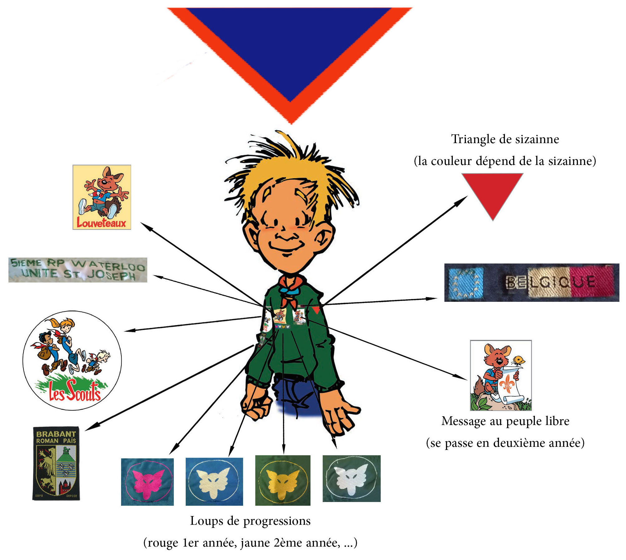 Sur le pull il y a une série d’écussons qui symbolisent l’avancement du louveteau au sein de la Meute.